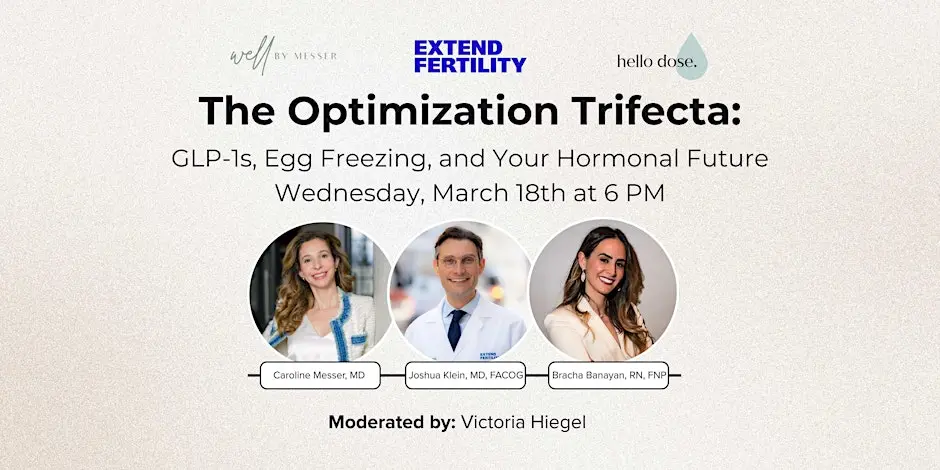 On Wednesday, March 18, from 6-8 p.m., Extend Fertility is hosting a free wellness panel: GLP-1s, Egg Freezing, and Your Hormonal Future. We’ve invited three experts in metabolic and reproductive health:
