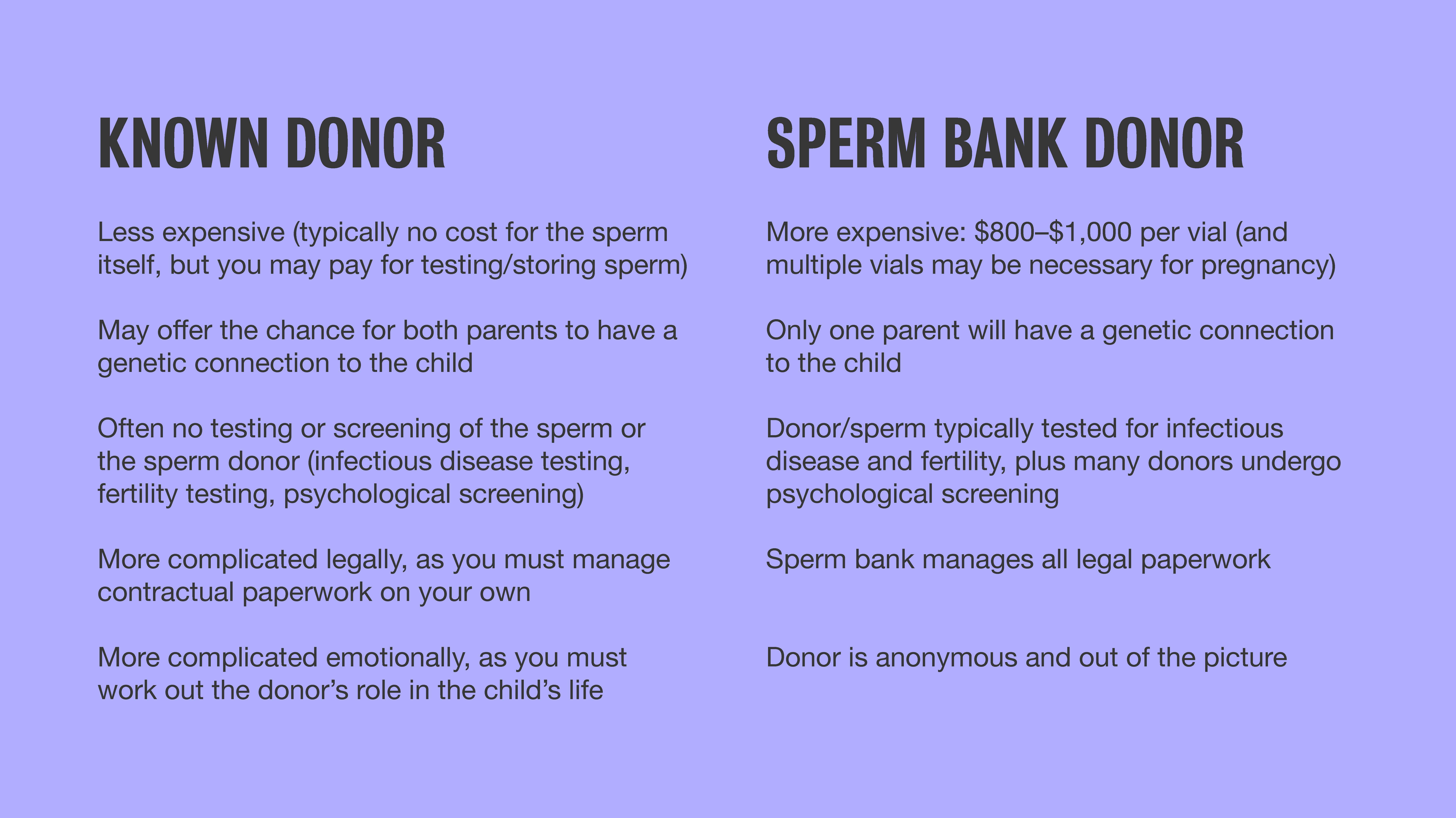 Most couples start here, and for good reason. Sperm from reputable banks is thoroughly screened for health, fertility, and infectious diseases, and it’s quarantined for at least six months for HIV testing. Since the donor has no parental rights, you don’t have to worry about future complications.